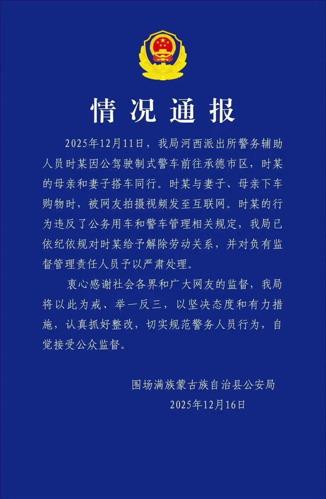 2025年12月11日,该局河西派出所警务辅助人员时某因公驾驶制式警车前往承德市区,时某的母亲和妻子搭车同行。时某与妻子、母亲下车购物时,被网友拍摄视频发至互联网。时某的行为违反了公务用车和警车管理相关规定,该局已依纪依规对时某给予解除劳动关系,并对负有监督管理责任人员予以严肃处理。