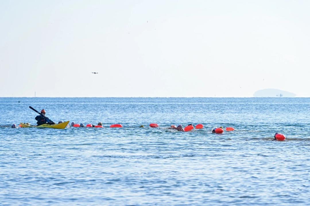 随着清脆的发令枪响,勇士们依次跃入海中,在碧波万顷的海面上划出一道道奋进的轨迹,尽管比赛当天海水温度较低,但参赛者们不畏严寒奋勇争先,收获了岸边观众的阵阵加油声与掌声。