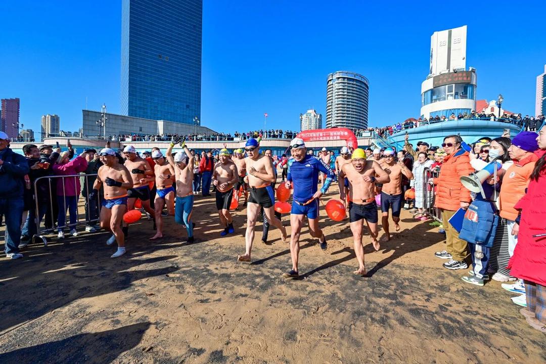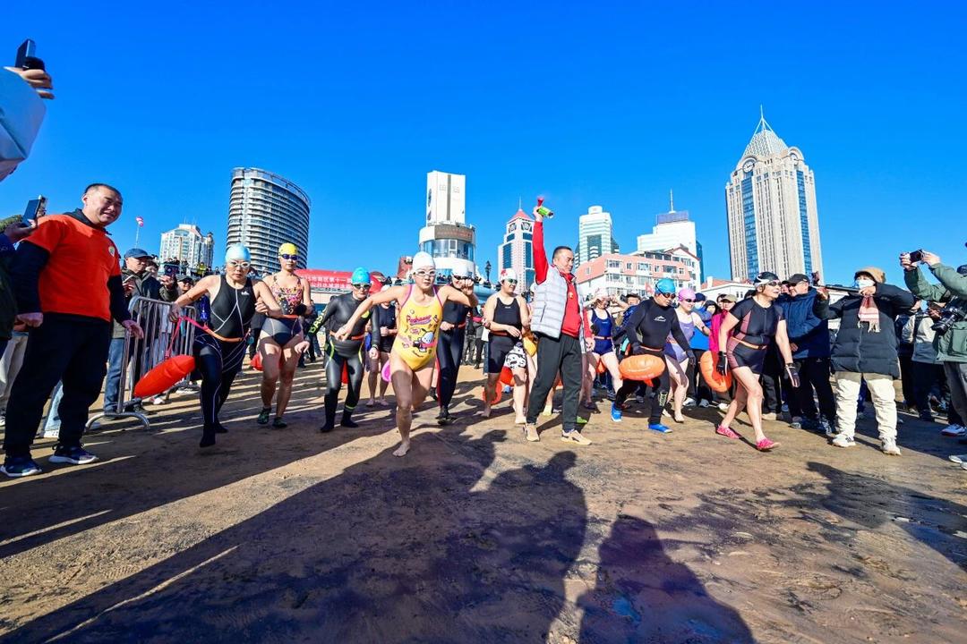 青岛栈桥冬泳赛举行,150名选手挑战严寒