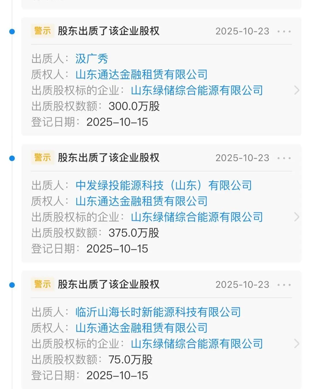 或为储能项目建设筹措资金所需,10月23日,山东绿储综合能源有限公司股东分别出质了企业股权,质权人为山东通达金融租赁有限公司。其中,中发绿投能源科技(山东)有限公司、汲广秀、临沂山海长时新能源科技有限公司分别出质股权数额为375万股、300万股、75万股。
