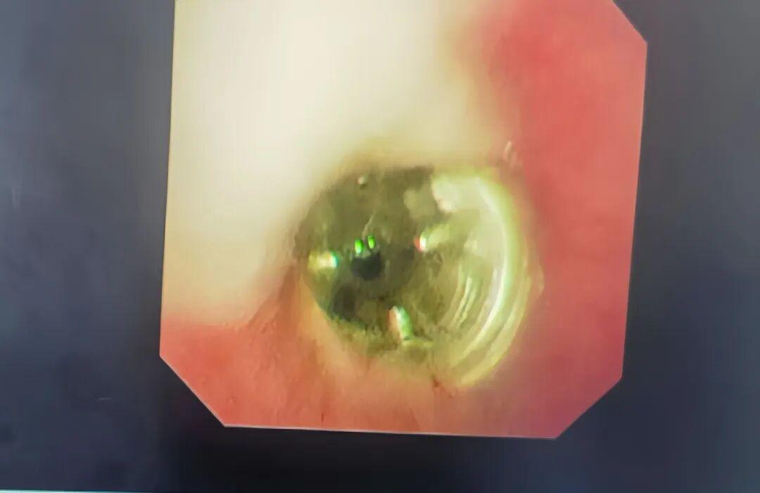 术中,纤细的支气管镜缓缓伸入患儿气道,清晰显示一枚银色圆锥体笔帽嵌顿在左主支气管内,周围黏膜充血水肿明显,伴肉芽增生,导致钳取难度加大。