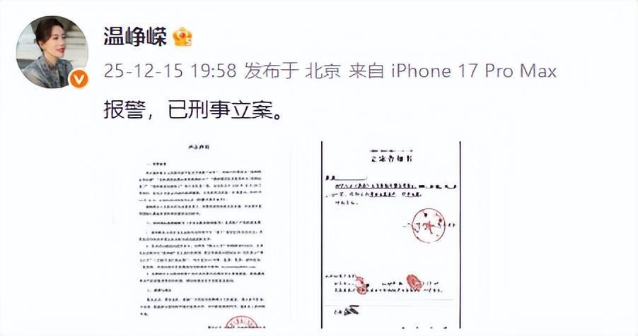 12月15日,演员温峥嵘发布严正声明并晒出立案告知书,配文:报警,已刑事立案。