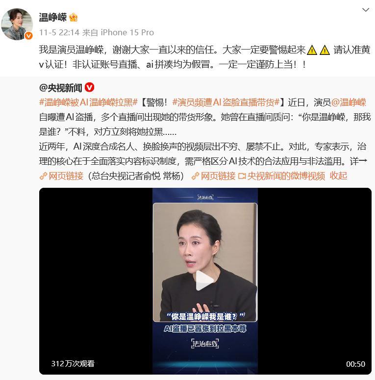 12月1日,温峥嵘发文称报警立案,并发出严正声明,部分内容如下:近期,网络上频繁出现以盗播、AI换脸等方式,非法使用温峥嵘女士形象售卖假冒伪劣产品的不法行为。经权威媒体曝光后,相关平台已对部分侵权人采取了封禁网络店铺、删除侵权作品、下架假冒伪劣商品等措施。不久后,该声明被删除。