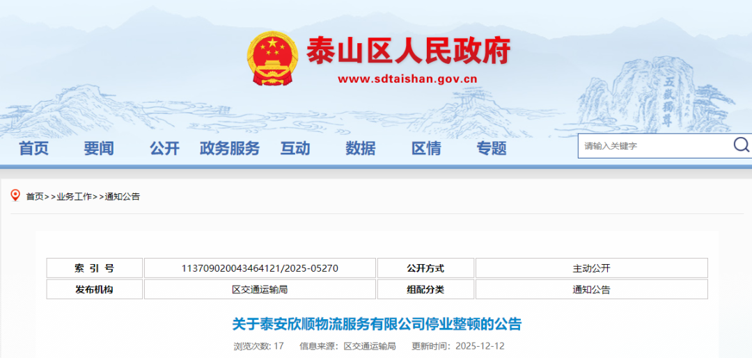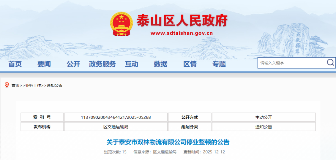 泰安市双林物流有限公司1年内违法超限运输的货运车辆已超过本单位货运车辆总数10%以上,依据《公路安全保护条例》第六十六条“道路运输企业1年内违法超限运输的货运车辆超过本单位货运车辆总数10%的,由道路运输管理机构责令道路运输企业停业整顿;情节严重的,吊销其道路运输经营许可证,并向社会公告。”的规定。现将泰安市双林物流有限公司(道路运输经营许可证号码:泰370902600159号)依法依规依程序予以停业整顿3天(自2025年12月13日至2025年12月15日)。