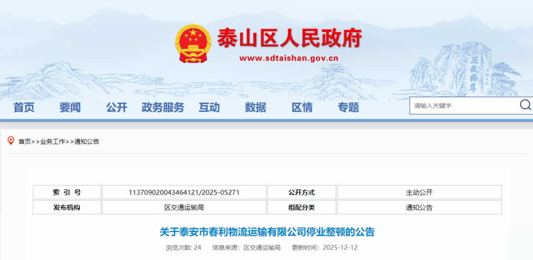 关于泰安市春利物流运输有限公司停业整顿的公告