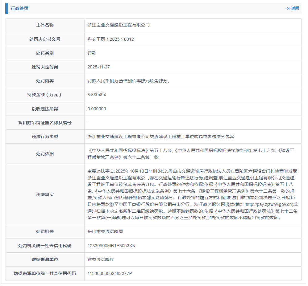 日前,信用浙江公示了浙江宝业交通建设工程有限公司的行政处罚决定。处罚决定书文号舟交工罚﹝2025﹞0012显示,2025年10月10日11时04分,舟山市交通运输局行政执法人员在普陀区六横镇台门村检查时发现浙江宝业交通建设工程有限公司存在交通运输行政违法行为,经调查,浙江宝业交通建设工程有限公司交通建设工程施工单位转包或者违法分包。依据《中华人民共和国招标投标法》第五十八条,《中华人民共和国招标投标法实施条例》第七十六条,《建设工程质量管理条例》第六十二条第一款的规定,罚款人民币捌万叁仟捌佰零肆元玖角肆分。