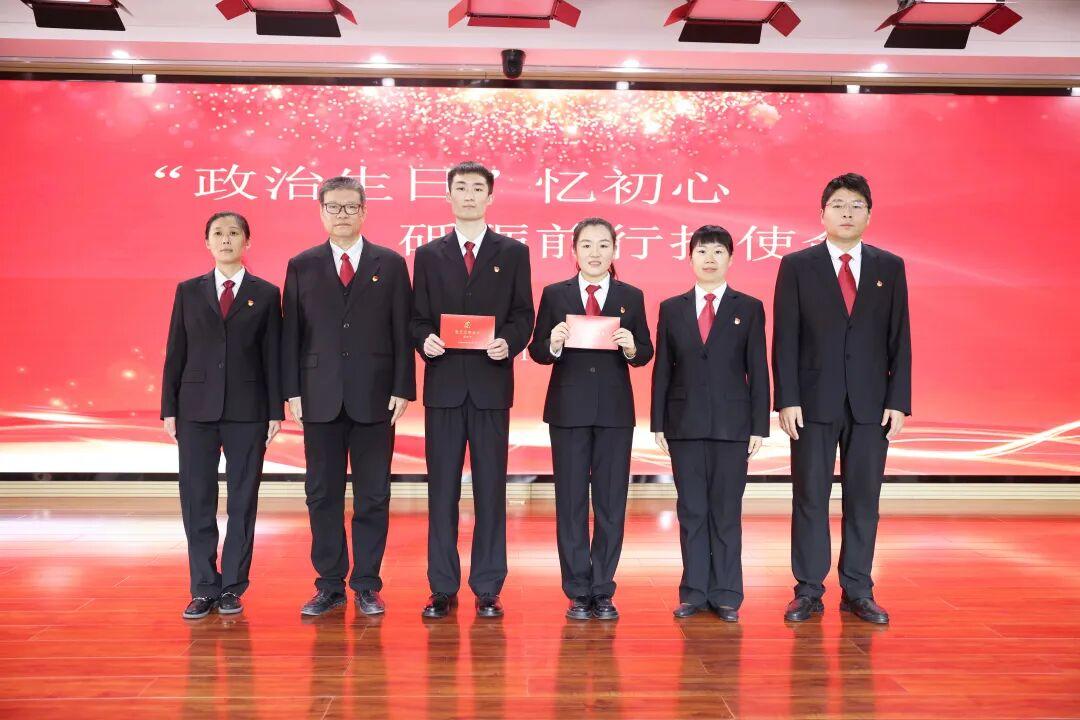 宣誓后,入党介绍人代表党支部为新党员送上“政治生日”纪念卡。一张纪念卡,是最好的政治生日礼物,饱含着党组织的关怀与期许。双手托举贺卡,捧着的不仅是真挚祝福,更是沉甸甸的党员责任,激励着他们在法治路上坚守初心、勇毅前行。