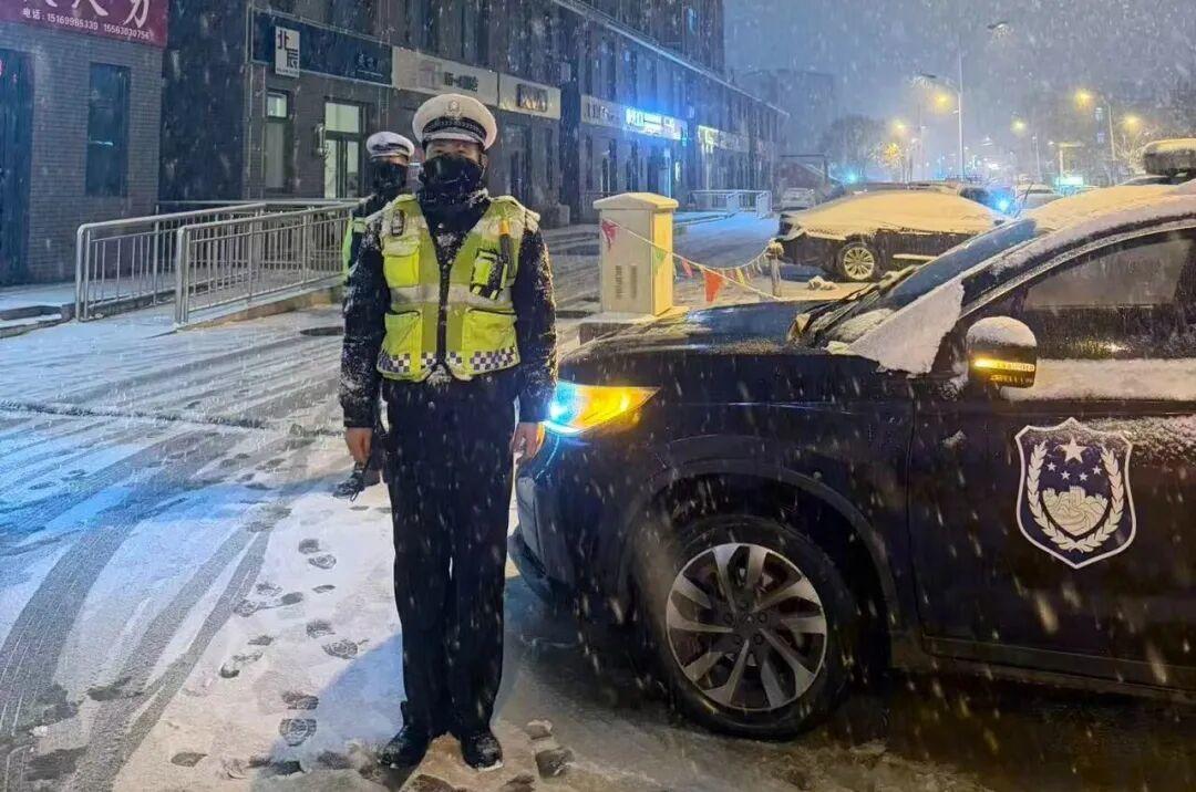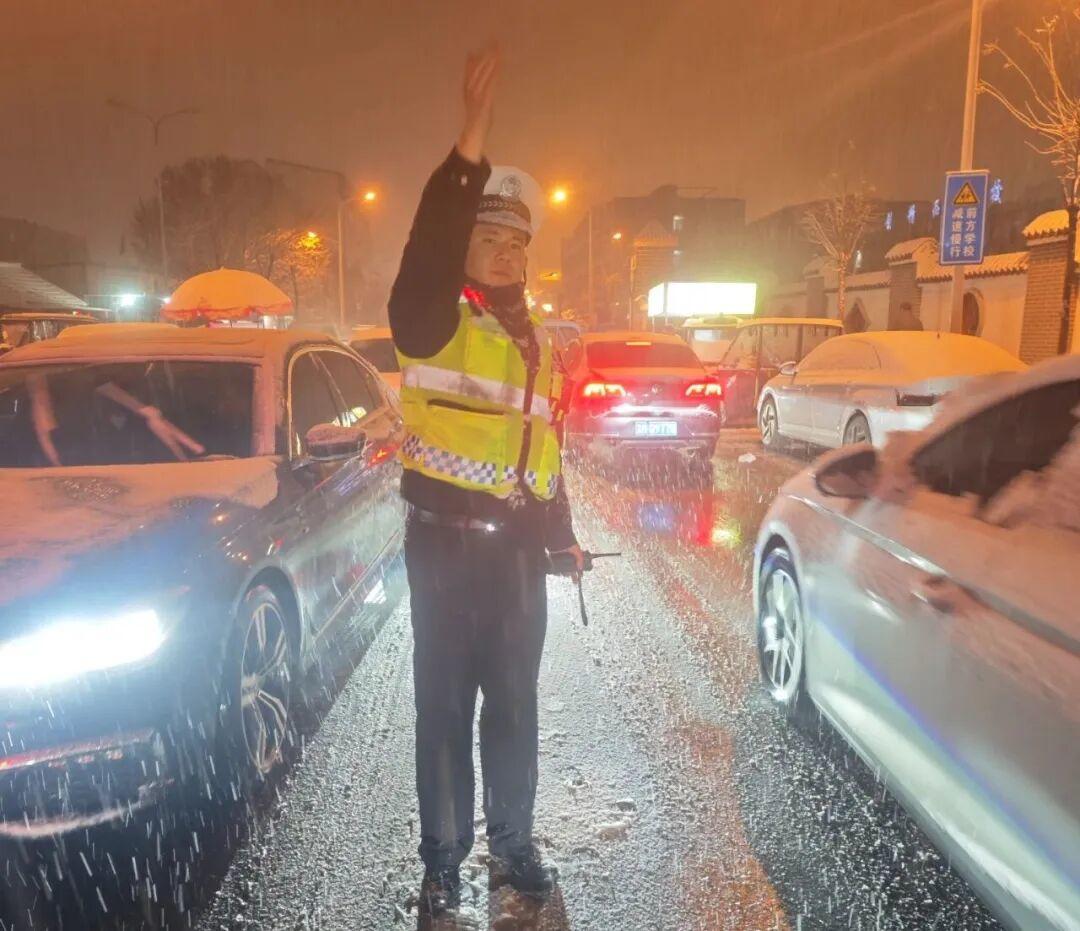 傍晚时分,雪来。交管部门在车流人流量较大的路口、路段,执勤民警通过闪烁警灯、手势指挥、安全喊话等方式,不断提醒过往车辆“减速、控距、亮尾灯”。同时,积极联动相关部门洒布融雪剂、清理积雪。
