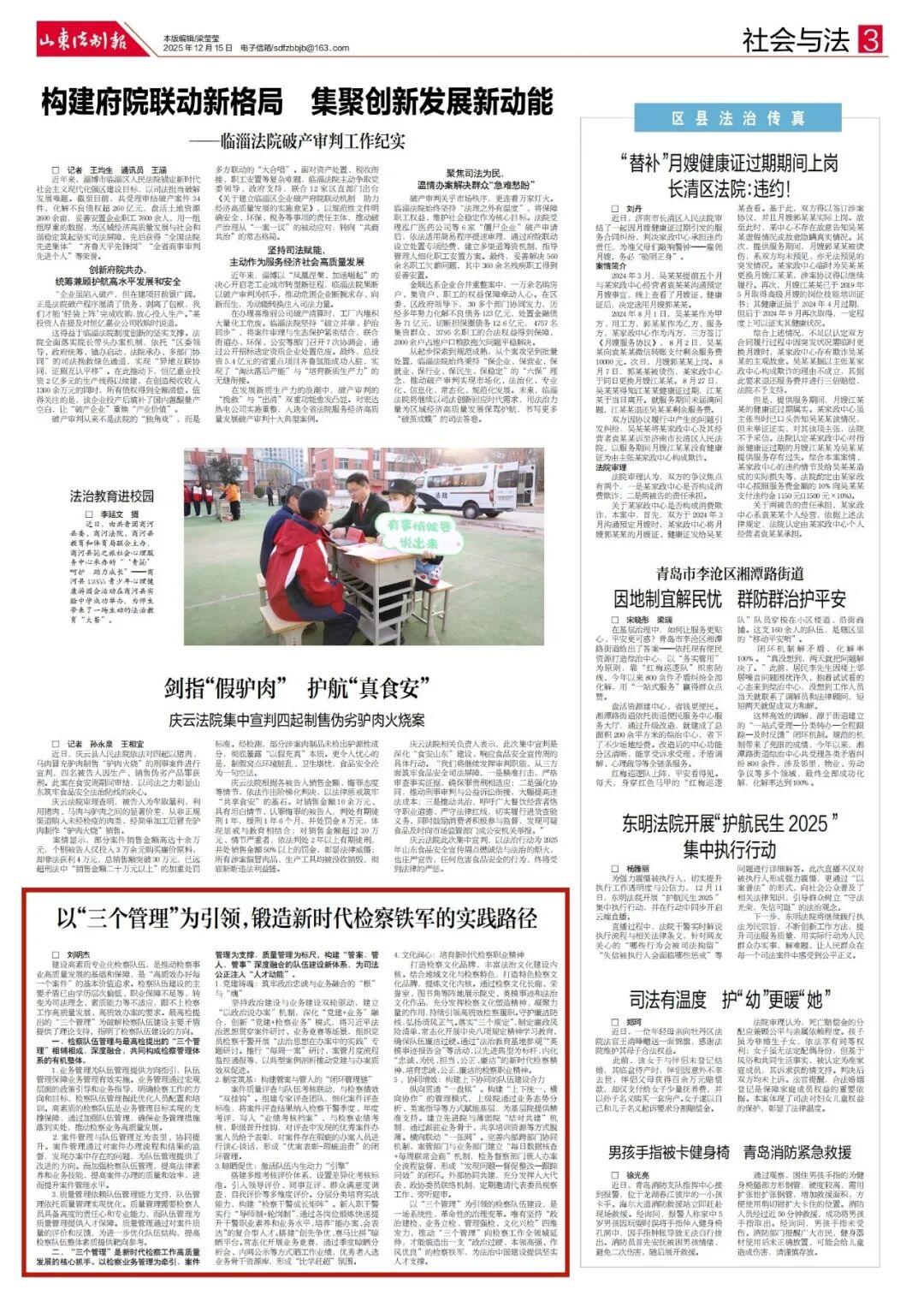 二、“三个管理”是新时代检察工作高质量发展的核心抓手。以检察业务管理为牵引、案件管理为支撑、质量管理为标尺,构建“管案、管人、管事”深度融合的队伍建设新体系,为司法公正注入“人才动能”。