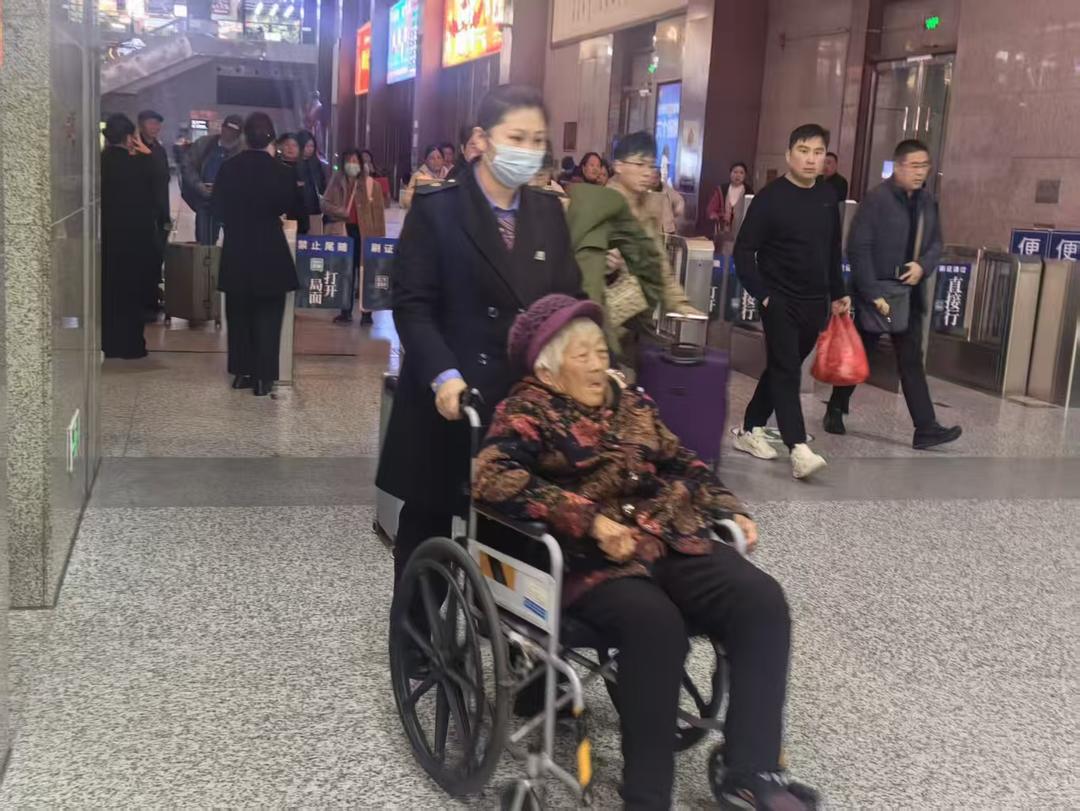 列车检票临近,工作人员提前为两位老人开辟绿色通道,全程搀扶引导,并推着爱心轮椅。上车前,工作人员还与列车长进行细致对接,详细说明老人的情况,确保老人在后续旅程中仍能得到妥善照料。