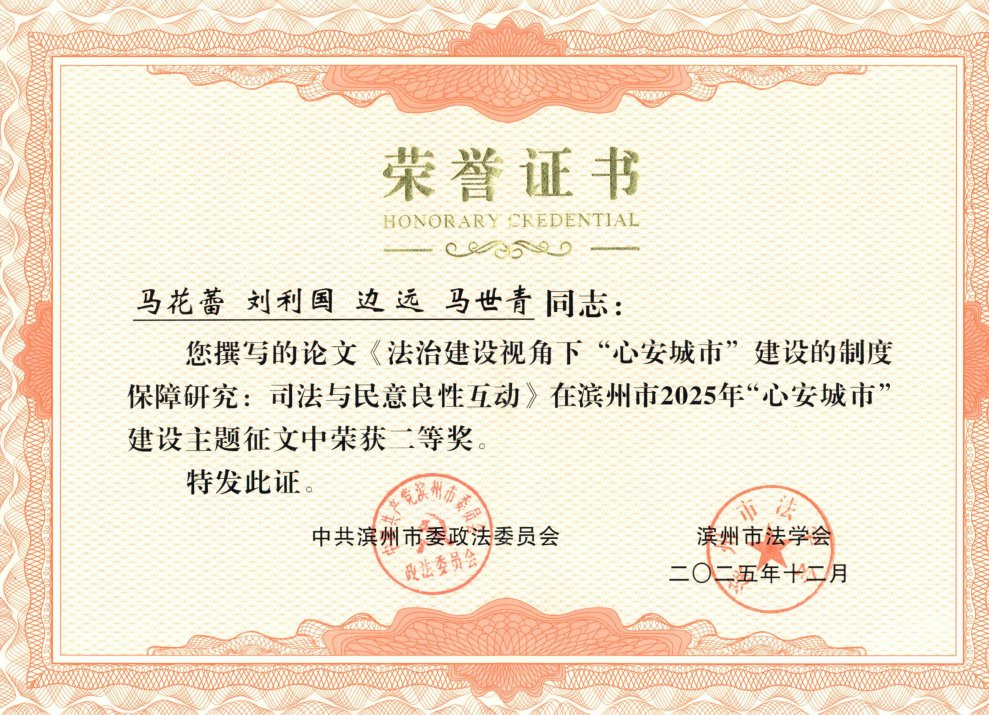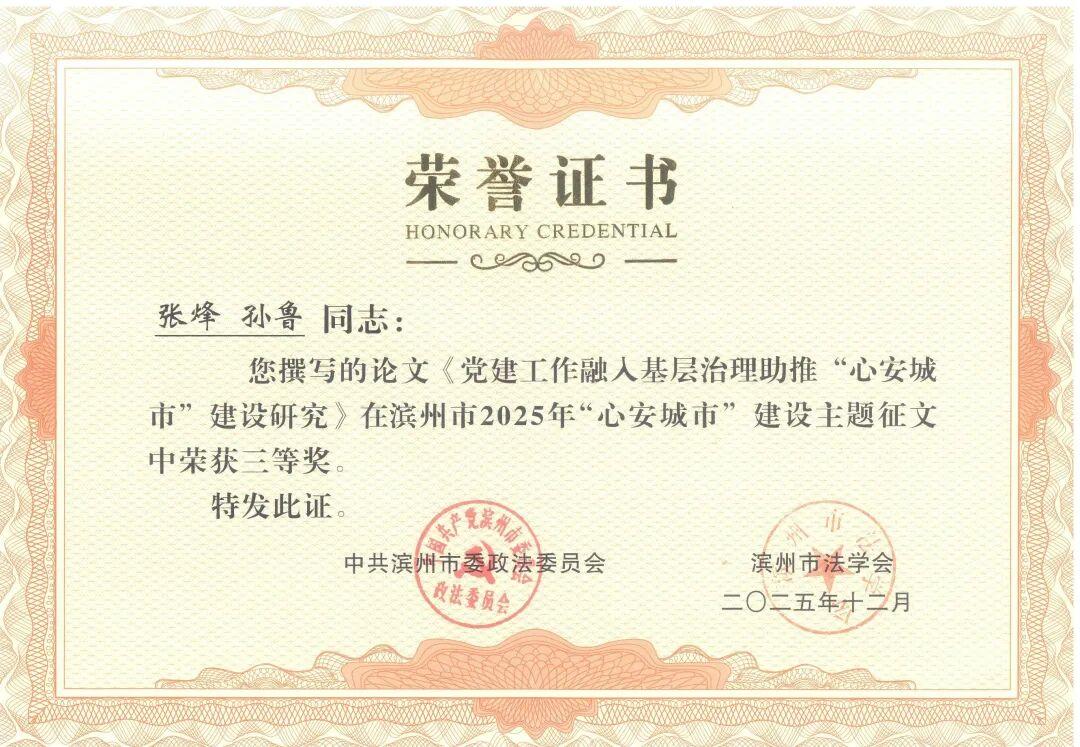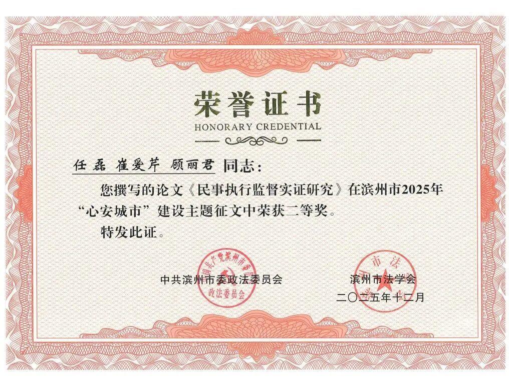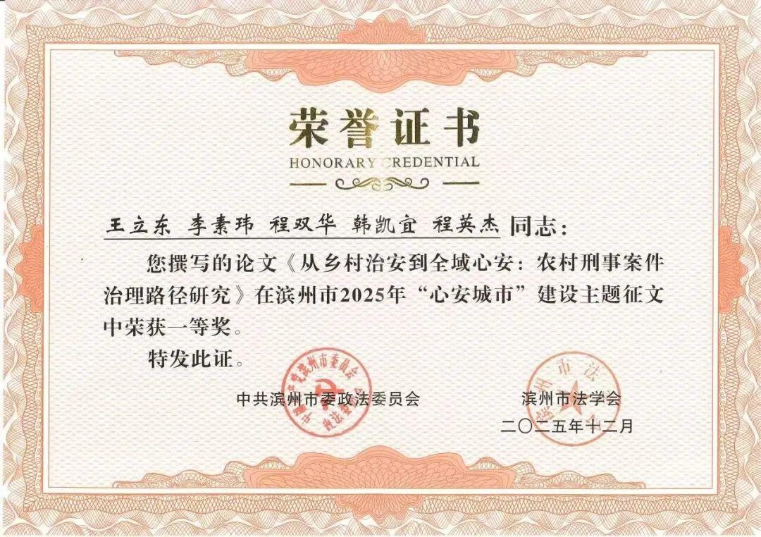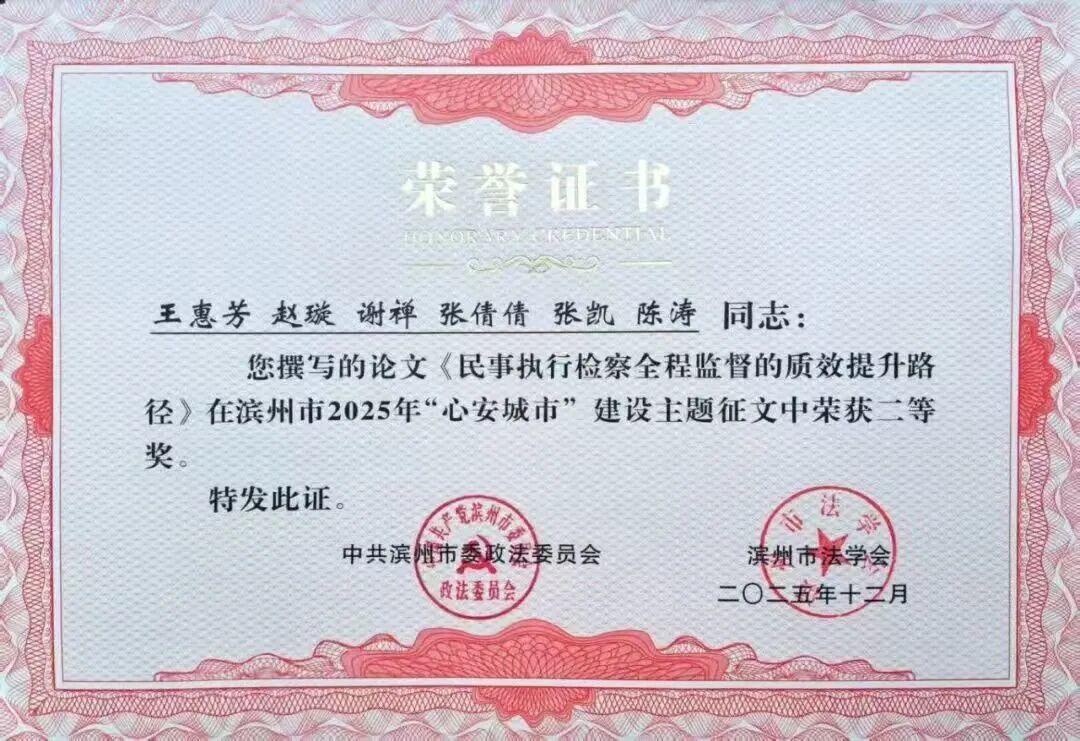 近日,在滨州市委政法委、市法学会组织开展的2025年全市“心安城市”建设主题征文活动中,全市检察机关共有5篇作品获奖,其中一等奖1篇,二等奖3篇,三等奖1篇。