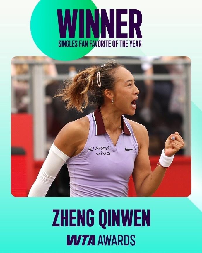 郑钦文蝉联WTA最受球迷欢迎单打球员