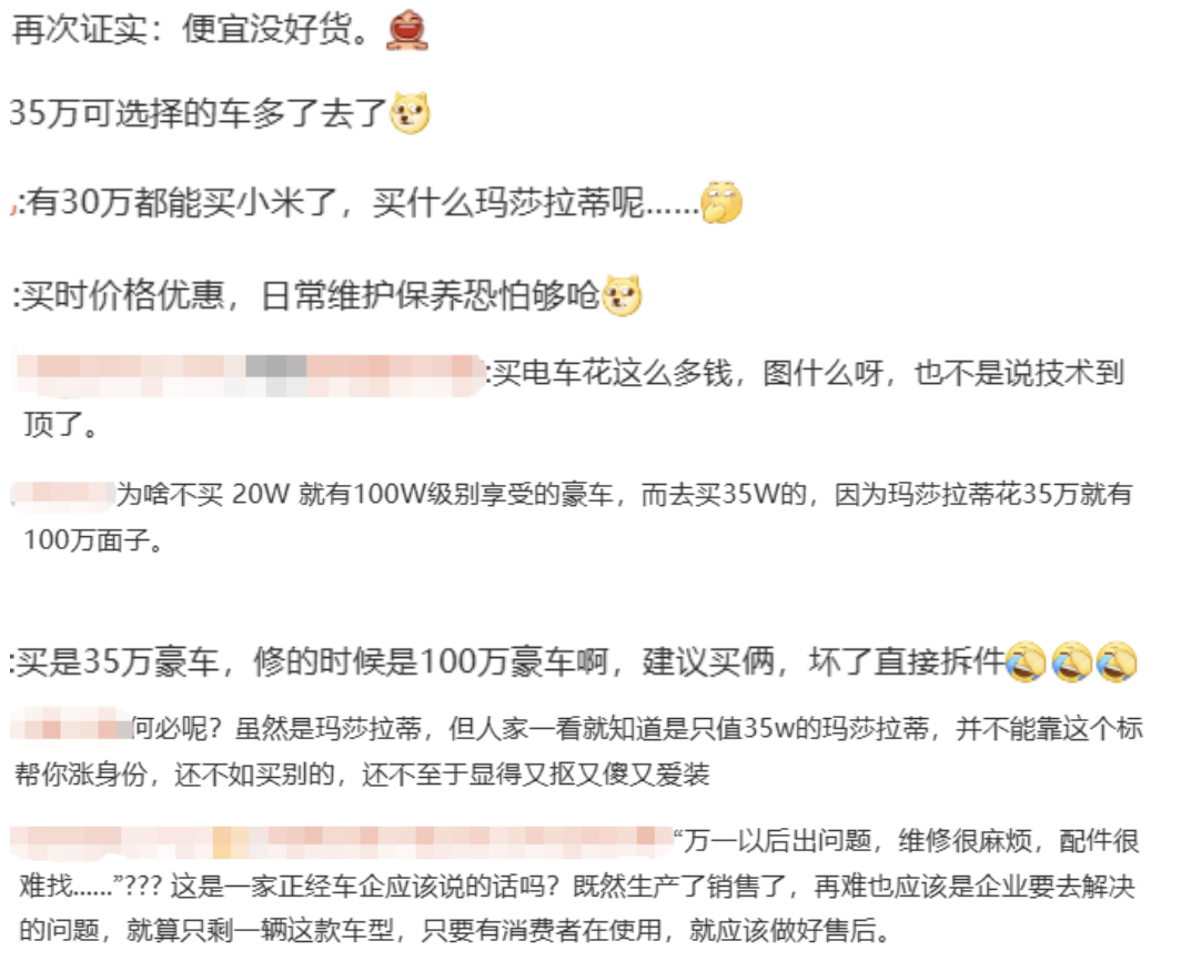 但也有部分网友不看好此次玛莎拉蒂降价售出行为,还调侃买玛莎拉蒂只为撑面子。
