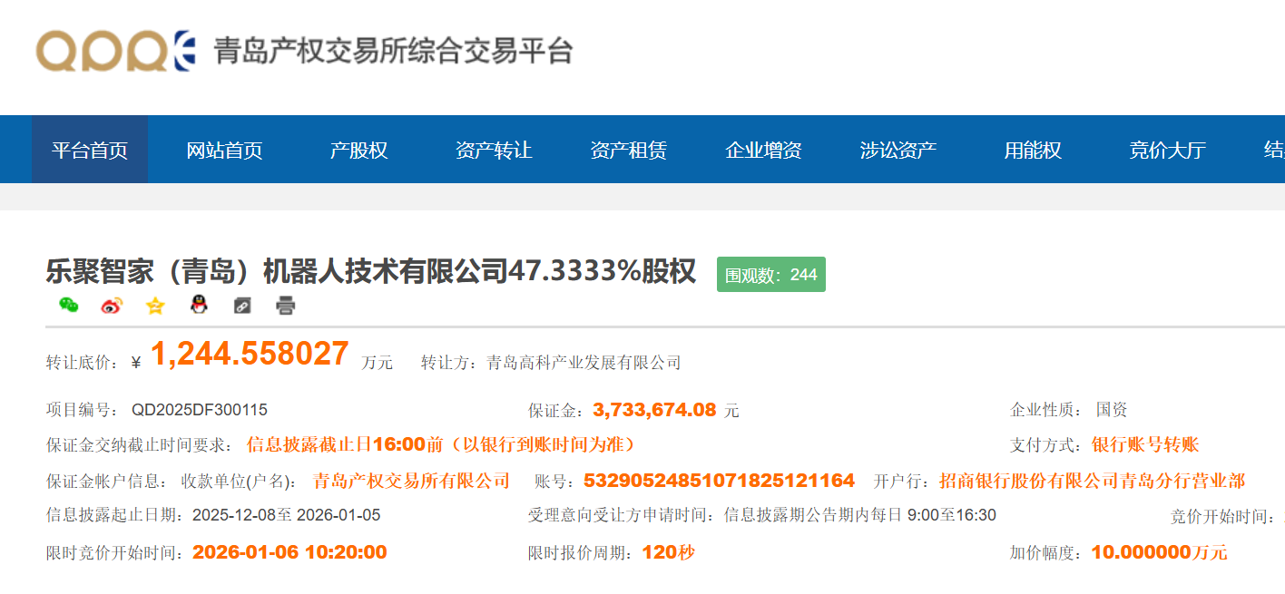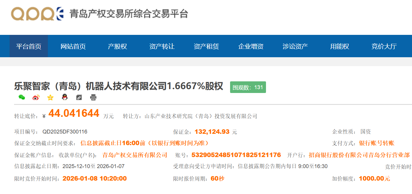 近日,乐聚智家(青岛)机器人技术有限公司(下称“青岛乐聚智家”)约1.67%股权转让项目和约47.33%股权转让项目在青岛产权交易所挂牌,转让底价分别为44.04万元和1244.56万元,转让方分别为山东产业技术研究院(青岛)投资发展有限公司(下称“青岛产研院”)和青岛高科产业发展有限公司(下称“青岛高科产发”)。