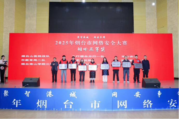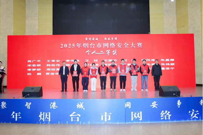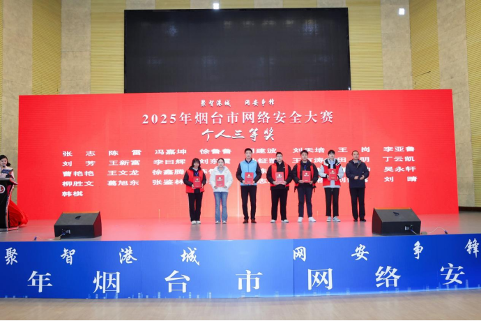 12月12日,由烟台市委网信办、市委办公室(保密局、密码管理局)、市直机关工委、市总工会、市发展改革委、市教育局、市工业和信息化局、市公安局、市财政局、市人力资源和社会保障局、市国动办、市大数据局、市国家安全局联合主办,烟台职业学院承办的2025年烟台市网络安全大赛圆满落幕。烟台南山学院积极备赛、奋勇争先,在决赛中斩获多项荣誉,共摘得网络安全团体三等奖2项,贾俊华同学荣获数据安全个人二等奖1项,王文龙、蒋一帆等6名同学荣获网络安全个人三等奖6项。