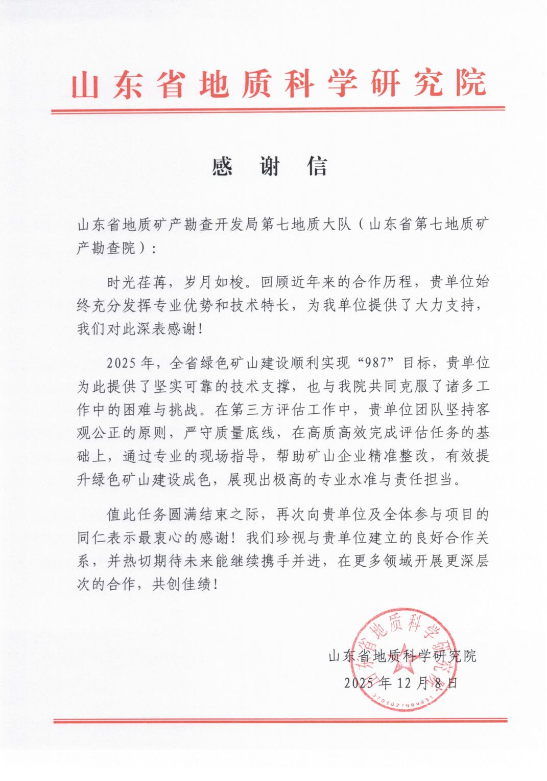 感谢信指出,在多年的合作历程中,七队始终秉持专业初心,充分发挥自身技术特长与资源优势,与山东省地质科学研究院携手同行、并肩作战。2025年,全省绿色矿山建设 “987”目标顺利达成,这一硕果的背后,离不开双方的紧密协作与不懈努力。在绿色矿山建设相关的第三方评估工作中,七队项目团队坚守客观公正原则,严守质量底线,高效优质完成各项评估任务。同时,通过专业细致的现场指导,助力矿山企业精准找准问题、高效完成整改,切实提升了绿色矿山建设的质量与成色,以实际行动彰显了地质人的专业水准与责任担当,为目标达成提供了坚实可靠的技术支撑。