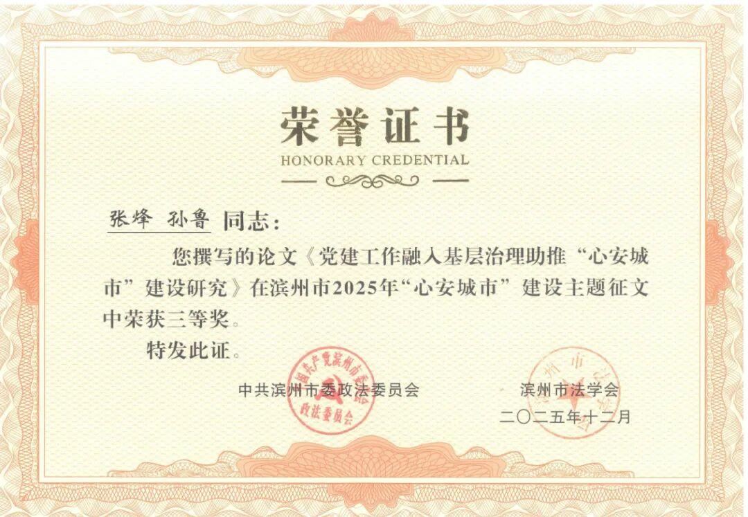 为深入贯彻习近平法治思想,全面落实党的二十大和二十届二中、三中、四中全会精神,进一步助推“心安城市”建设,滨州市委政法委、滨州市法学会在全市范围内组织开展了“心安城市”建设主题征文活动。其中,邹平市人民检察院张烽、孙鲁撰写的论文《党建工作融入基层治理助推“心安城市”建设研究》荣获三等奖。