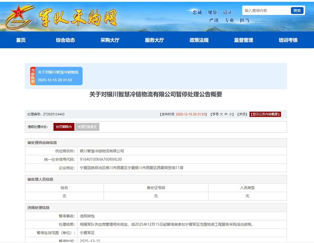 12月15日,宁夏军区保障局发布《关于对银川智慧冷链物流有限公司暂停处理公告》,经调查,银川智慧冷链物流有限公司在参加项目编号:2024-VGCBAA-F1001采购活动中,涉嫌存在违规失信行为。根据军队供应商管理相关规定,自2025年12月15日起暂停其参加宁夏军区范围物资工程服务采购活动资格。