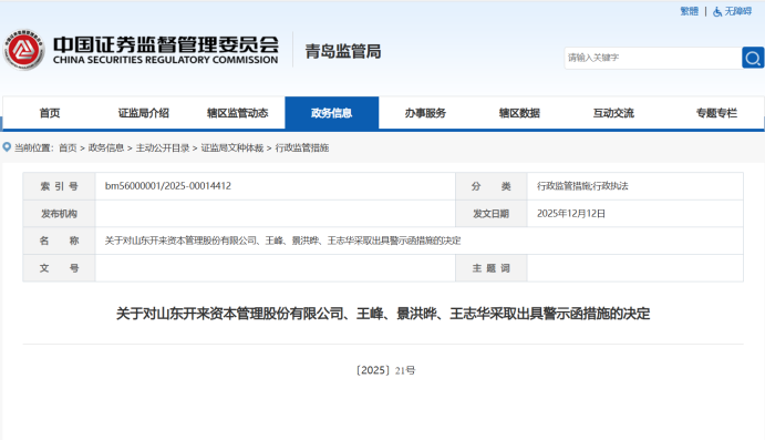 12月12日,证监会青岛监管局官网披露的行政监管措施决定书显示,山东开来资本管理股份有限公司以及王峰、景洪晔、王志华因三项违法违规被采取出具警示函的行政监管措施。