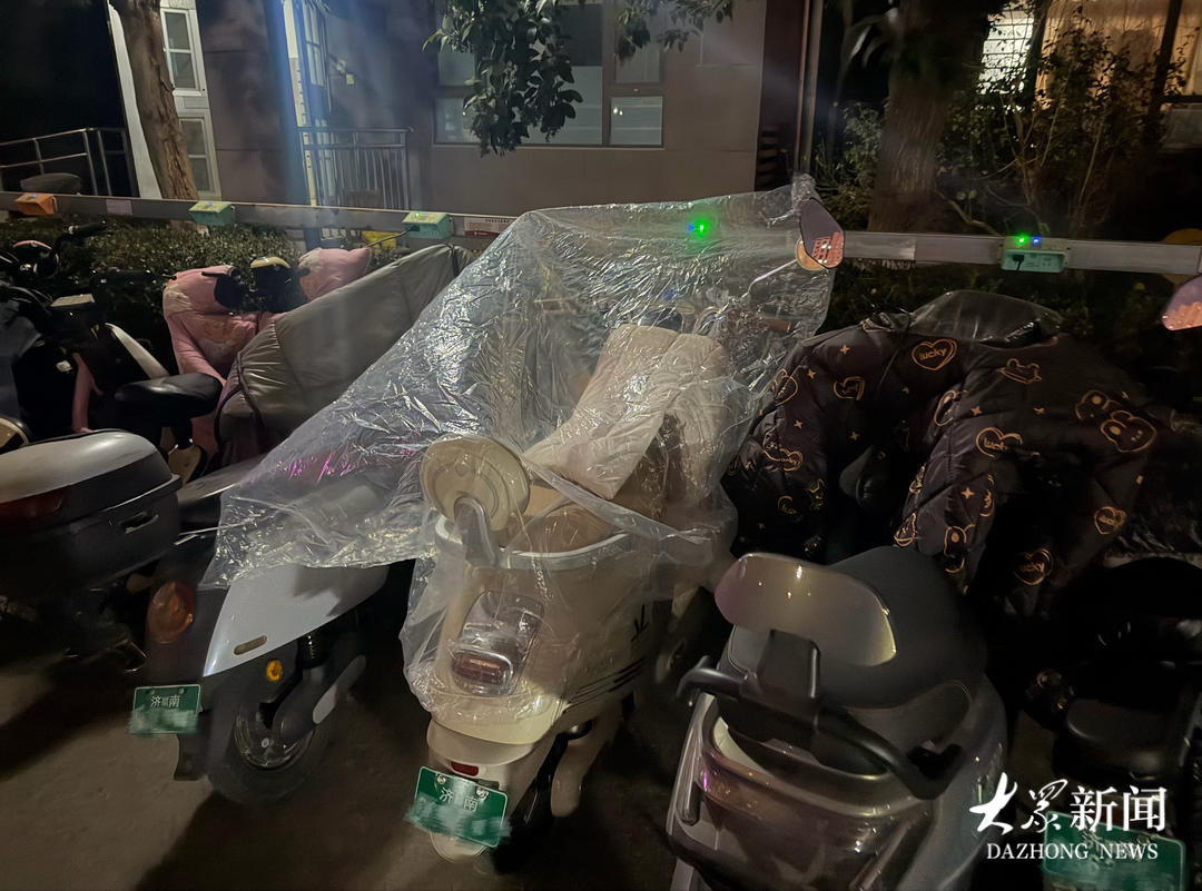 “看天气预报说可能要下雪,盖一下安心点,下雪了也好清理。”雨雪天气露天充电是否会担心?李女士表示,车棚的充电口早就被占满了,只能在露天充,担心也没办法。