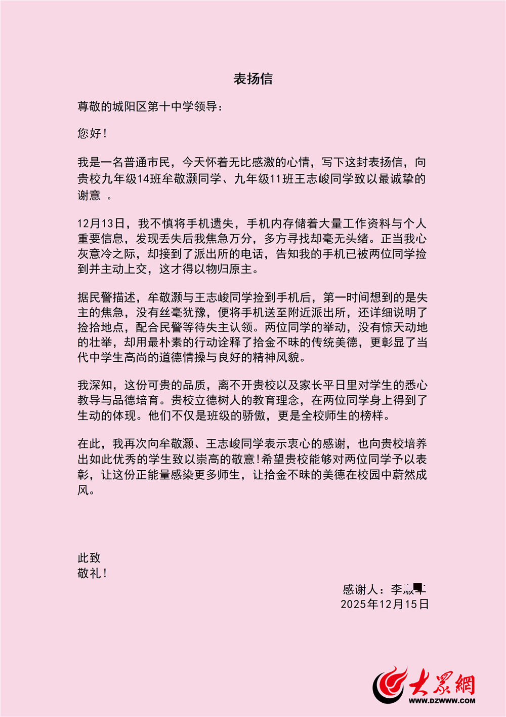 “手机里有好多重要资料,丢了之后急得睡不着,真没想到能找回来,太感谢这两个孩子了!”12月15日,市民李女士特意写下感谢信,向青岛市城阳区第十中学九年级14班牟敬灏、九年级11班王智军两位同学表达诚挚谢意。