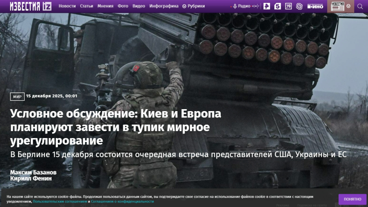 俄罗斯《消息报》网站12月15日报道,欧洲方面继续试图改写乌克兰的和平计划,而不考虑俄罗斯的利益。针对美乌等方面在柏林的会谈,俄罗斯联邦委员会国际事务委员会主席格里戈里·卡拉辛表示,俄方希望柏林会谈能够加快和平进程,也希望解决方案能够带来长期和平。但遗憾的是,目前很难指望英法德等欧洲国家和乌克兰会有这样的表现。他们或提出可能“使问题复杂化”的新条款。