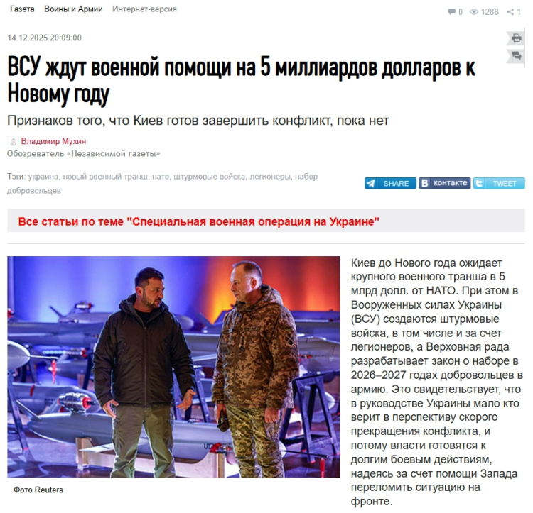俄罗斯《独立报》网站当地时间12月14日报道,新年到来之际,乌克兰正等待北约提供价值50亿美元的大笔军事援助。与此同时,乌克兰武装部队已经开始建立一支突击部队,包括使用外国雇佣兵。乌克兰最高拉达也正在起草一项法案,要求在2026年至2027年招募志愿兵。这些都表明,在乌克兰领导层中,几乎没有人认为冲突会很快结束,因此他们正在为长期敌对状态做准备,他们希望依靠西方的援助在前线取得突破。