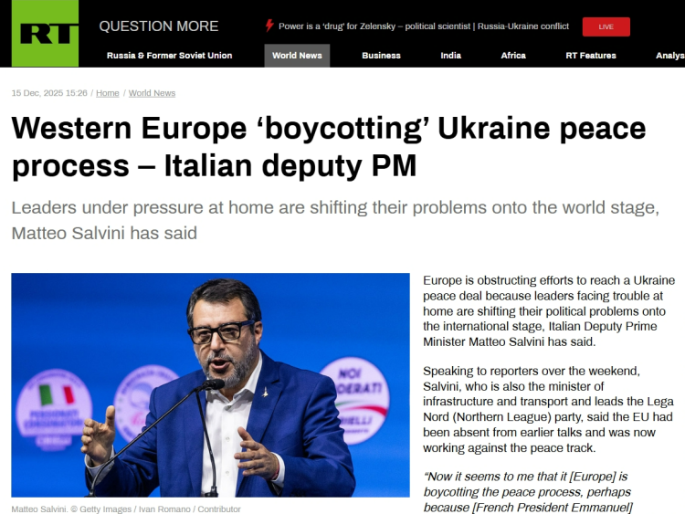 今日俄罗斯电视台网站12月15日则援引意大利副总理兼基础设施与交通部长马泰奥·萨尔维尼的话称,西欧国家阻挠俄乌和平协议达成的努力,因为这些国家的领导人希望在国内面临困境时将政治问题转移到国际舞台上。他还强调,意大利并非冲突的一方,“我不希望我的孩子们去与俄罗斯开战”。
