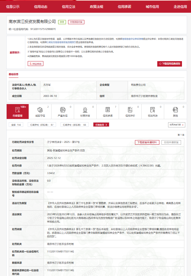 近日,齐鲁晚报·齐鲁壹点记者从信用中国获悉,南京滨江投资发展有限公司在未取得占用林地手续的情况下,于2023年5月至2023年12月以开展滨江开发区供热管网一期工程项目为由,擅自在江宁区江宁街道南山湖社区光大路南端以西20米与光国生物能源厂区道路以东80米之间进行施工,致使江宁街道南山湖社区集体林地被占用。被南京市江宁区农业农村局行政处罚。