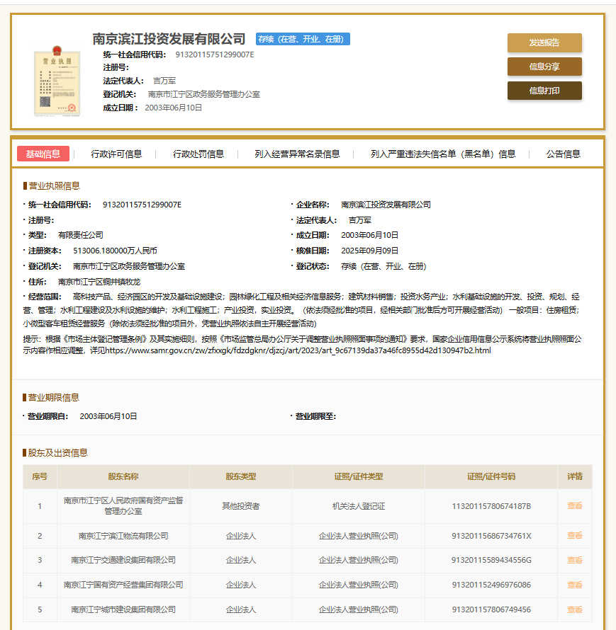 公开信息显示,南京滨江投资发展有限公司成立于2003年6月10日,法定代表人吉万军,注册资本513006.18万元。