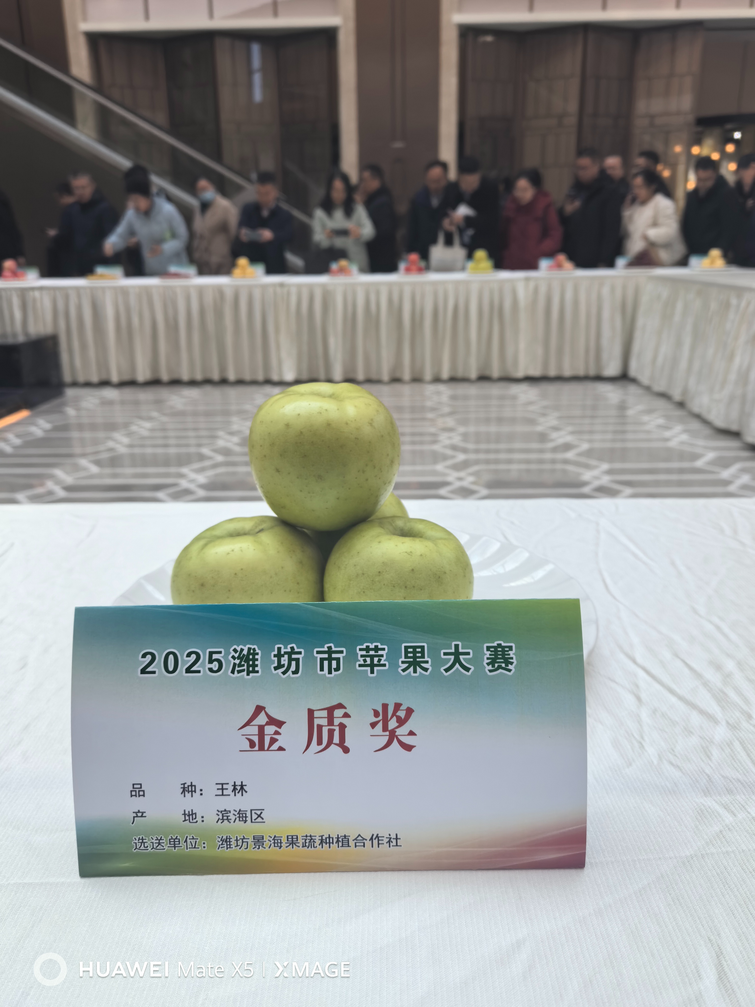 近日,潍坊滨海区潍坊景海果蔬种植合作社选送的王林苹果在2025潍坊市苹果大赛中荣获金质奖,这是“滨海红”苹果第四次荣获潍坊市苹果大赛金质奖,标志着经过多年的精心培育与品质打磨,“滨海红”苹果已稳定达到潍坊市苹果品质的顶尖水平,成为潍坊苹果产业中一张亮眼的“品质名片”。