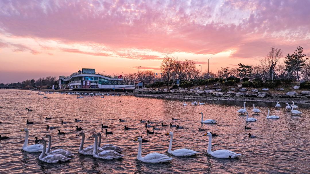 12月15日,山东省荣成市樱花湖湿地公园在漫天晚霞的映照下,呈现出一幅宁静和谐的自然画卷,成群的大天鹅在波光粼粼的湖面上悠然栖息、觅食,成为冬日滨海一道动人的风景线。