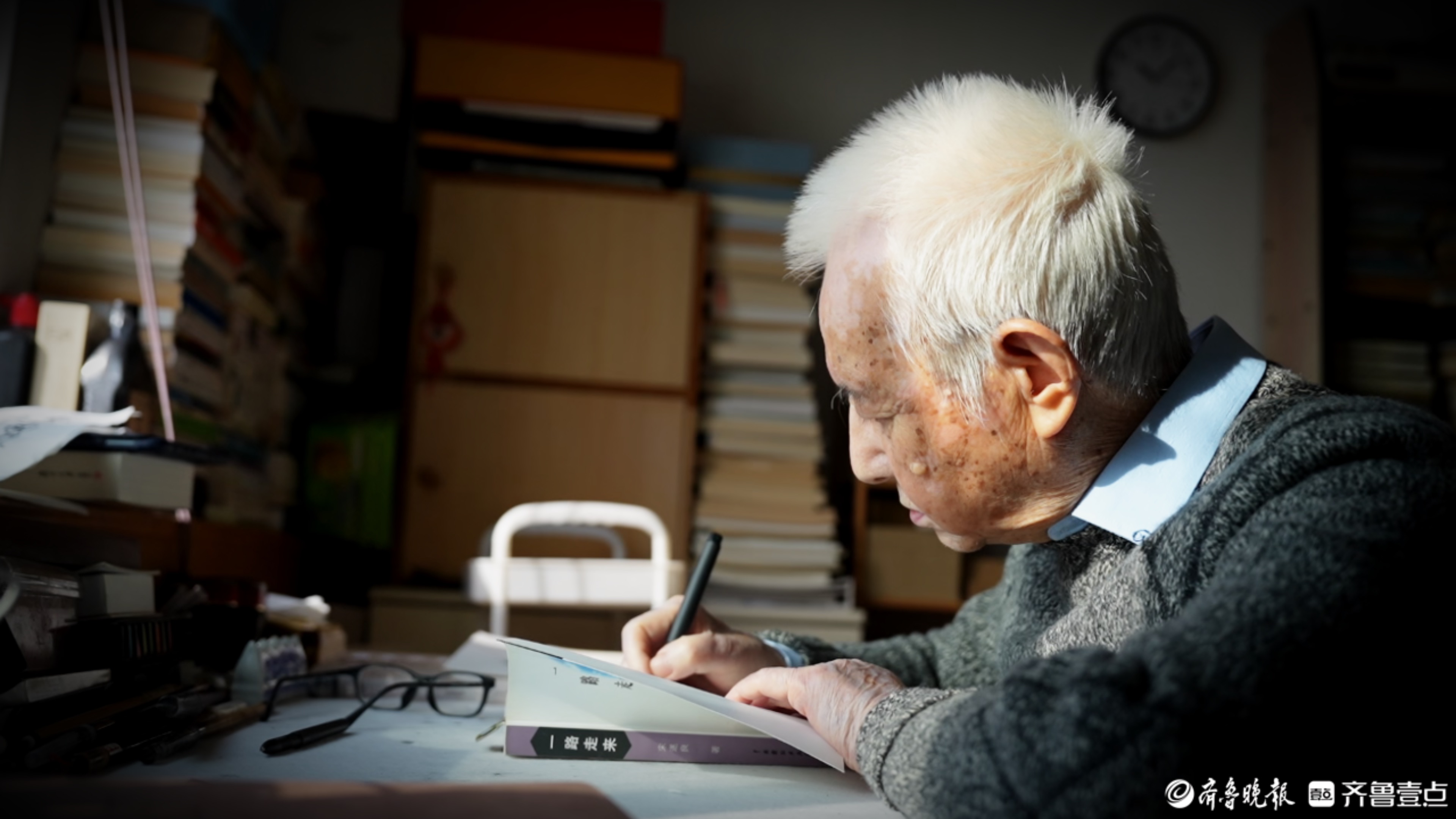 这是一栋老宿舍楼,楼道里隐约有股霉味。走进宋遂良的书房,却满是书香,书架上、地上一摞摞书码放得十分整齐。窗明几净,书桌上还留着清晨的笔墨痕迹。“这里面有一些好书,值得纪念的,我给山师图书馆捐了几次。现在眼睛不如从前,还有一些书来不及看,人家送给你的,你总得表个态,心里终归是个负担。”宋遂良招呼我们坐下。