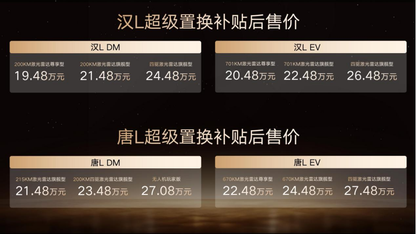 此次,汉L DM 3款车型,超级置换补贴后售价19.48万-24.48万元;汉L EV 3款车型,超级置换补贴后售价20.48万-26.48万元;唐L DM 3款车型,超级置换补贴后售价21.48万-27.08万元;唐L EV 3款车型,超级置换补贴后售价22.48万-27.48万元。