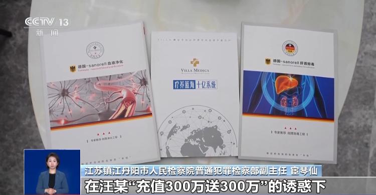 江苏镇江丹阳市人民检察院普通犯罪检察部副主任 宦琴仙:陈某夫妇出于自身健康的担忧,接受了所谓专家的治疗方案,原本打算充值200万元,在汪某“充值300万送300万”的诱惑下,当场充值300万元。2022年6月,二人再次复查,专家又以“血蛋白偏低”“妇科问题”“肝肾前列腺需养护”为由,建议继续治疗,陈某夫妇分三笔又充值100万元。