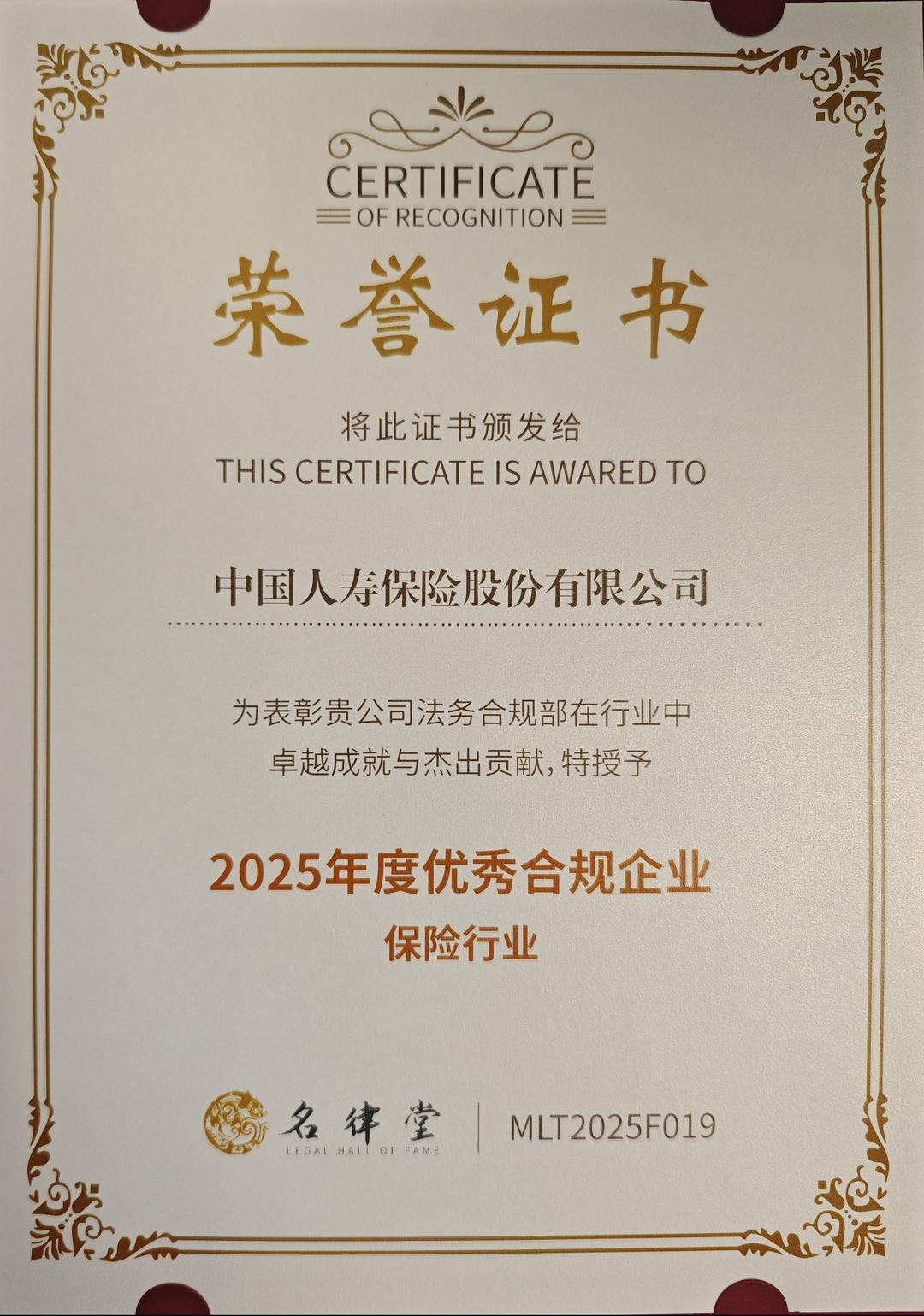 合规管理见实效,中国人寿荣获保险行业“2025年度优秀合规企业”