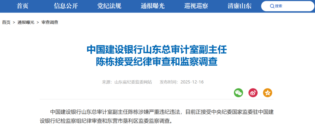 12月16日据山东省纪委监委网站消息中国建设银行山东总审计室副主任陈栋涉嫌严重违纪违法目前正接受中央纪委国家监委驻中国建设银行纪检监察组纪律审查和东营市垦利区监委监察调查