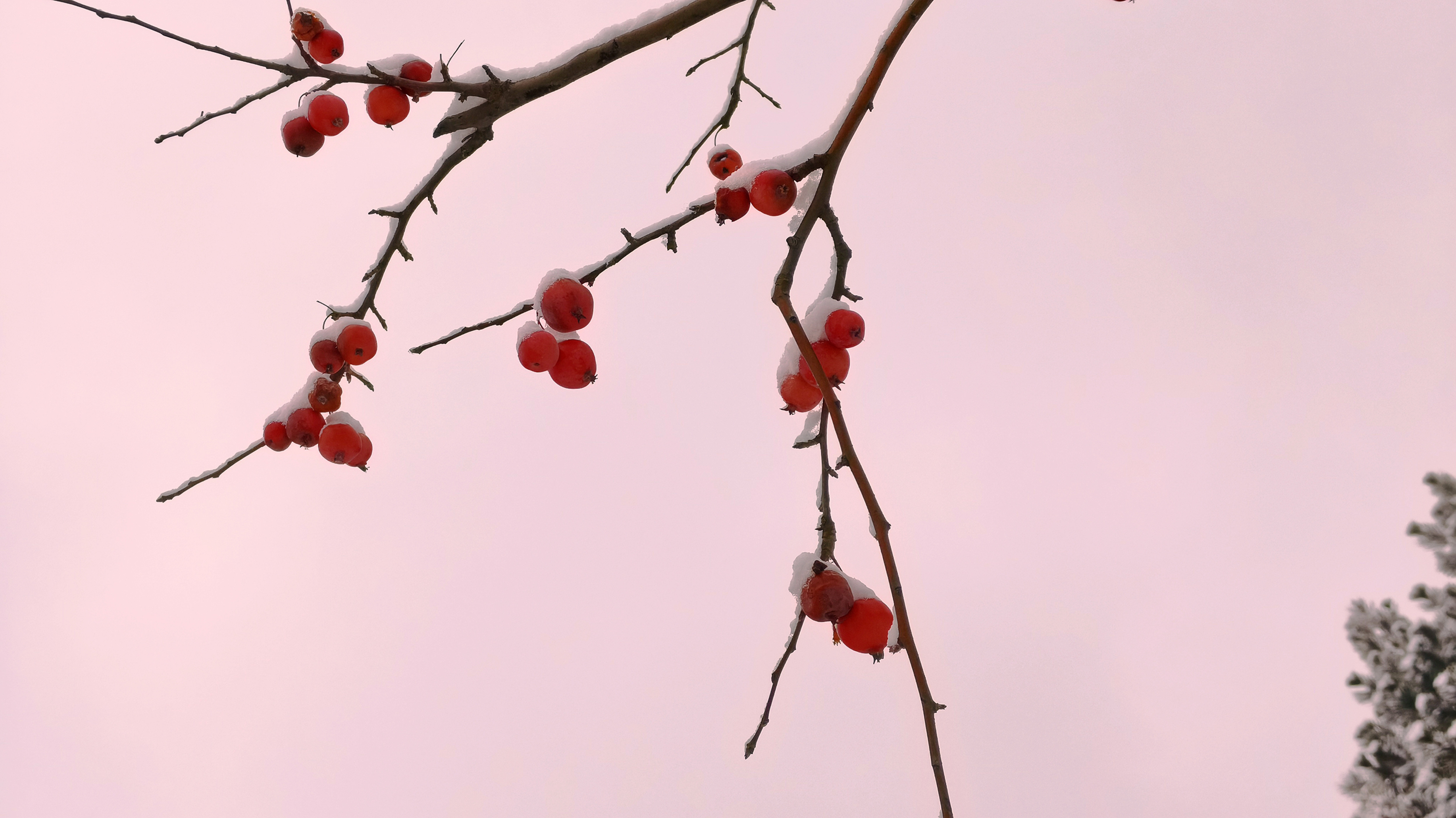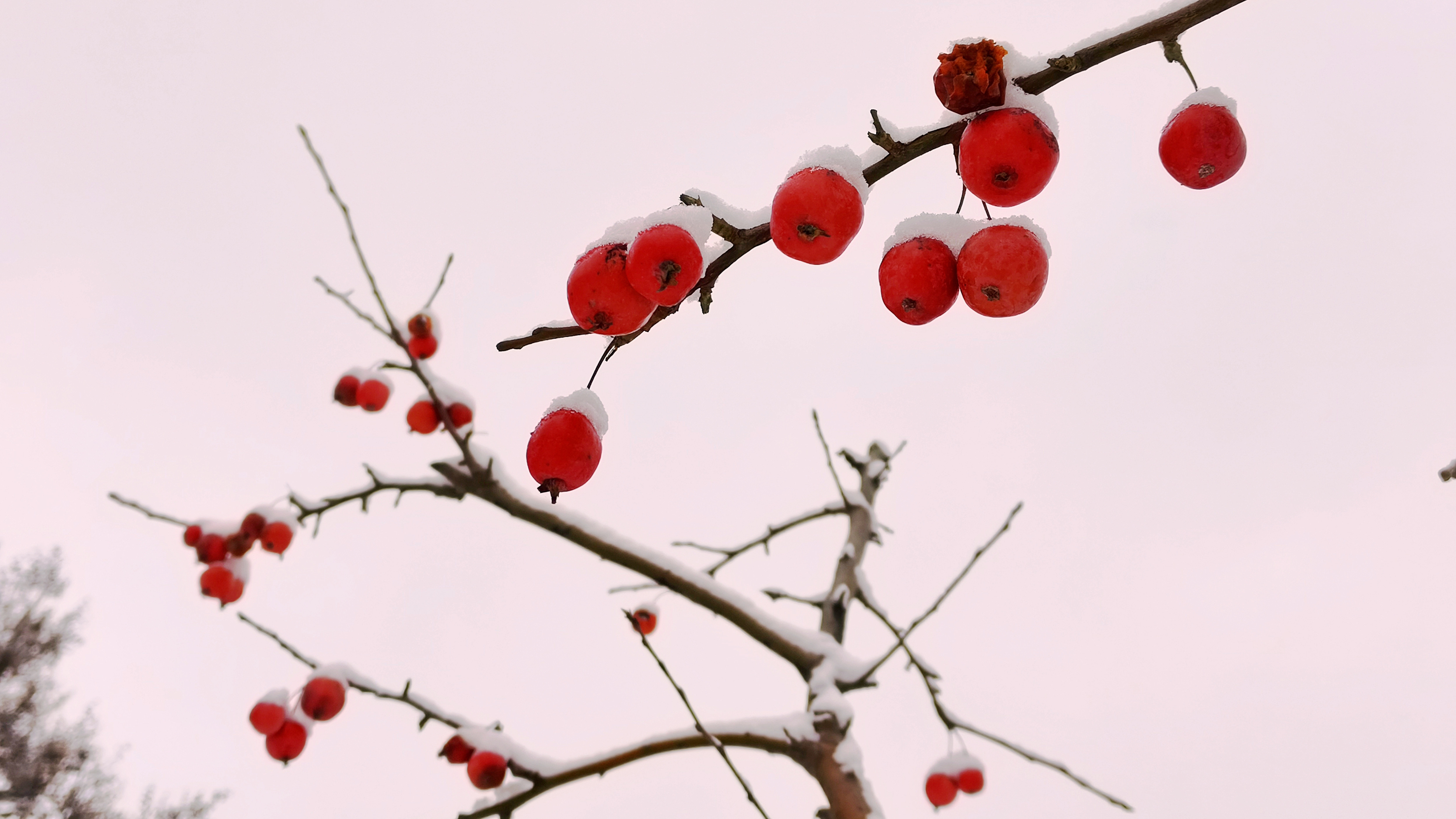 瑞雪覆盖的枝头柿子海棠如同点缀在素娟上的朱砂鲜艳得令人屏息利津县委办公室李树军拍摄