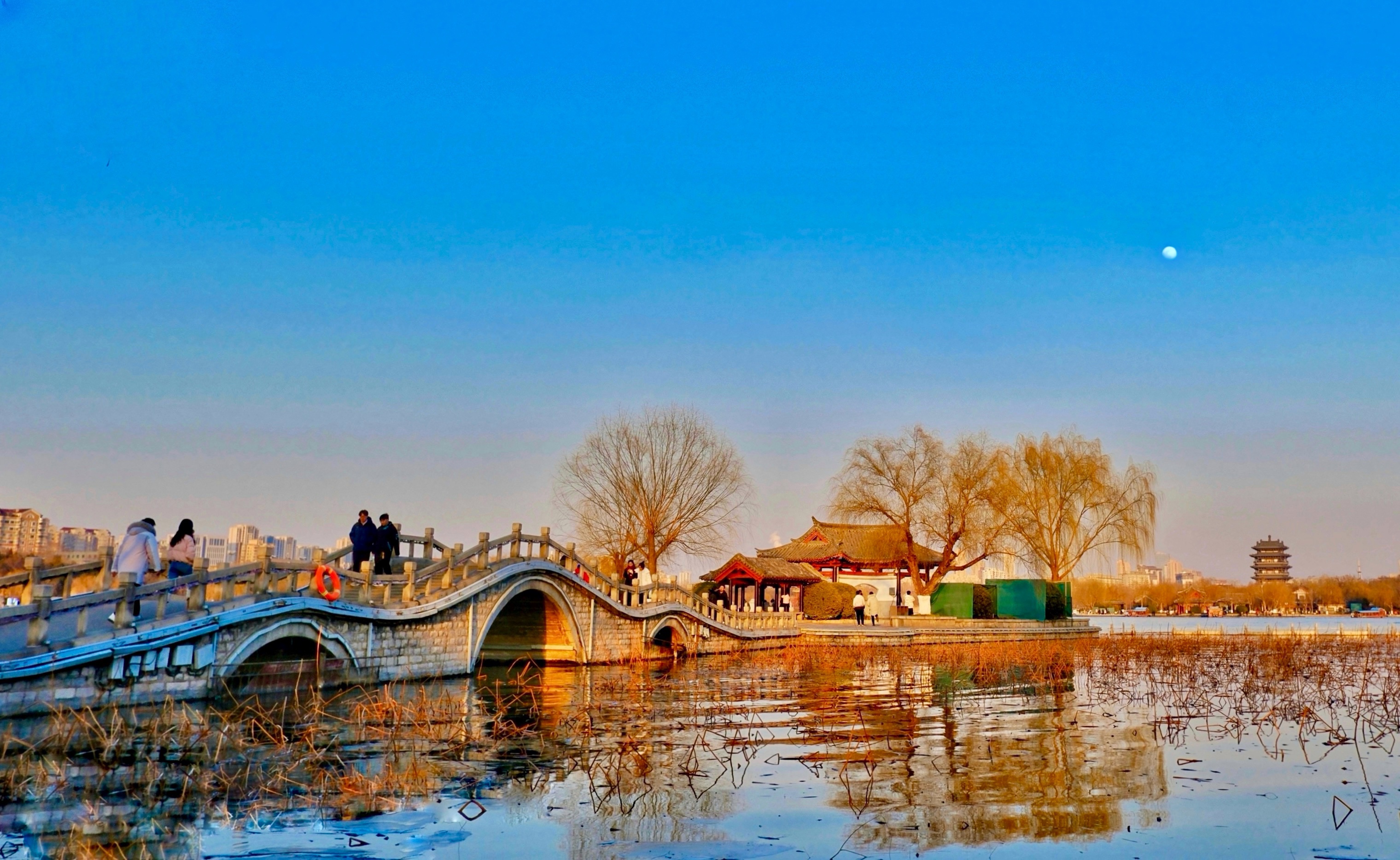 冬日薄暮的暖光如鎏金般铺裹在大明湖玉带桥上与蓝天湖面形成冷暖交织的绚丽色调疏柳古建相映成趣天上寒月与桥上行人添灵动生机湖景韵律既具北方冬日清冽又借暖调光影诠释主题让明湖冬景尽显静美与鲜活齐鲁师范学院董洪日拍摄