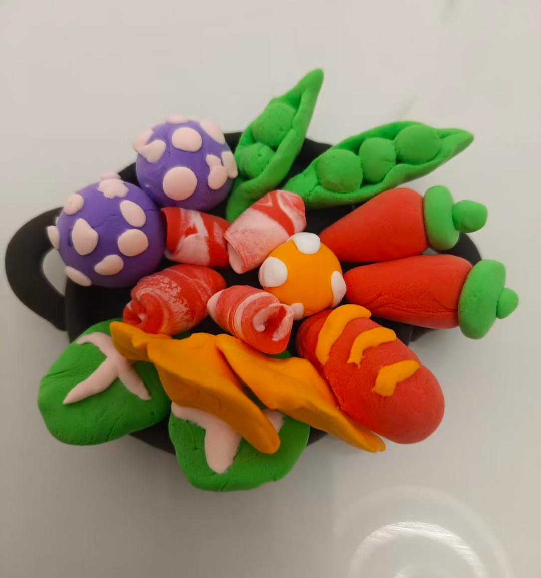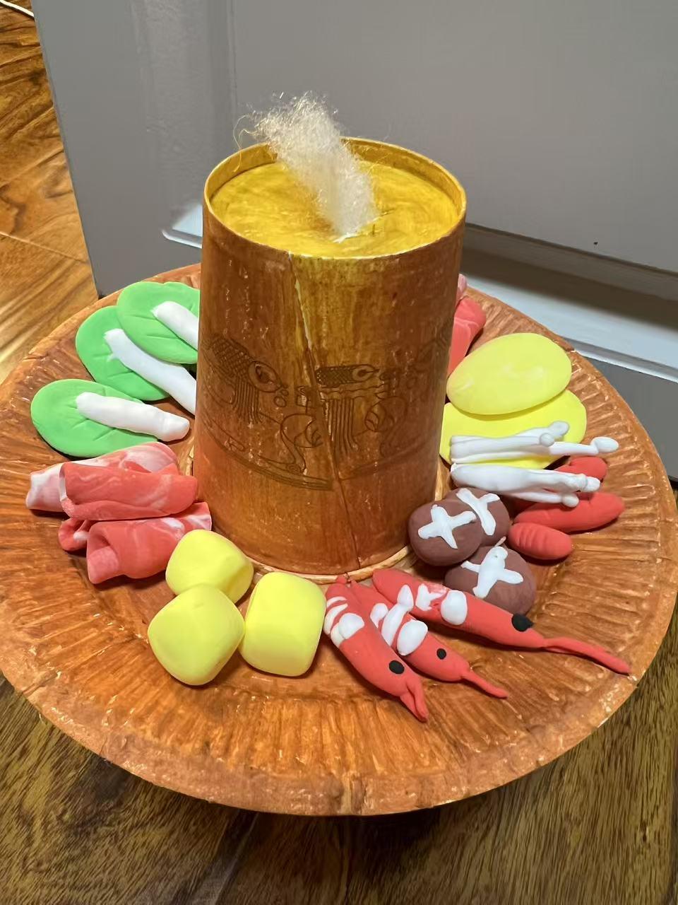 为让文化成果可视化,创意创作环节精彩上演。孩子们用黏土捏制出圆润 Q 弹的鱼丸、饱满紧实的肉丸,用画笔勾勒出金黄的玉米、鲜嫩的金针菇、绵长的粉丝,一件件作品栩栩如生,既还原了火锅食材的鲜活形态,更生动诠释了火锅 “包容共生、热情待客、团圆和睦” 的文化内核。在班级展示交流中,孩子们踊跃分享创作思路与文化发现,语言表达能力、逻辑思维能力在互动中得到提升,传统文化在交流中真正入脑入心。