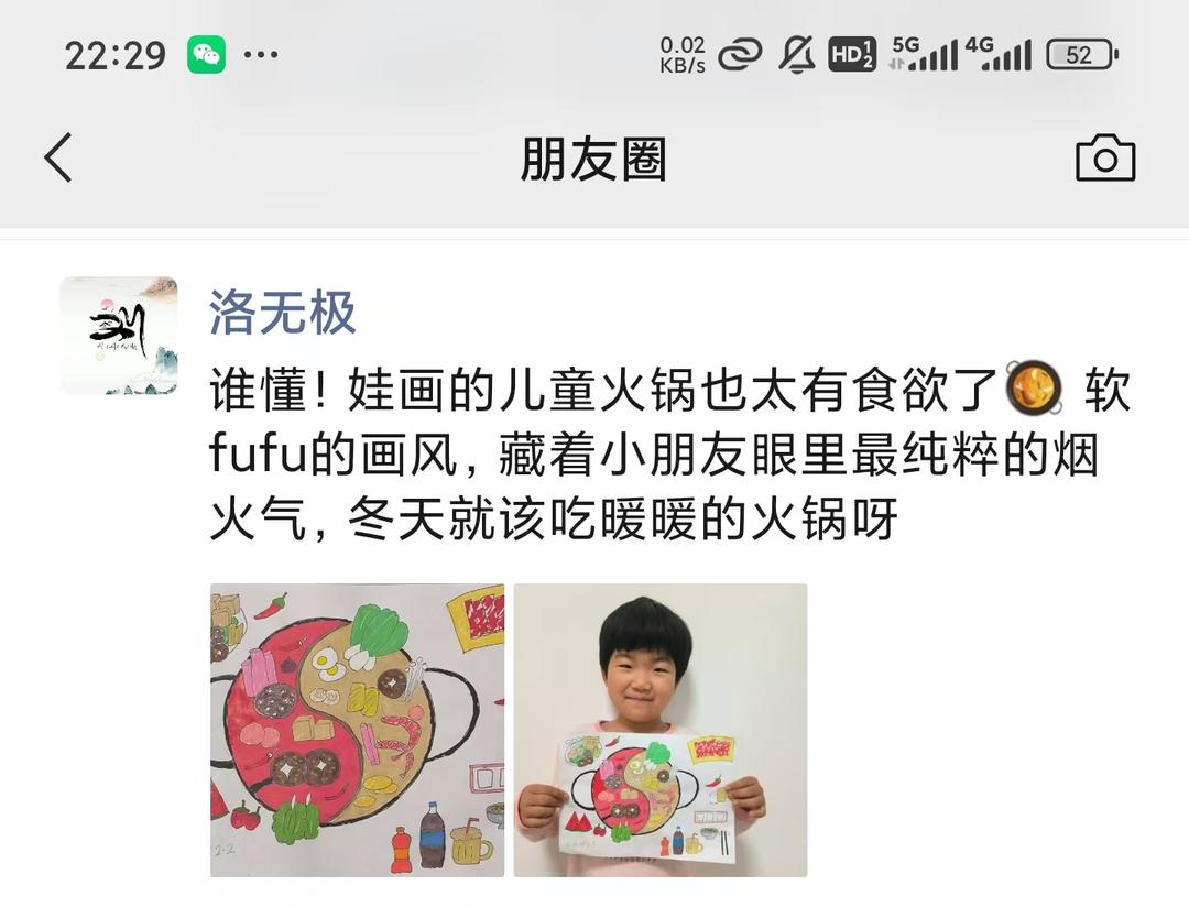 活动成果经家长分享至朋友圈后,迅速收获满屏点赞与好评。黏土作品的巧思、绘画创作的灵气,搭配家校携手陪伴的温暖,构成了孩子们成长路上的珍贵记忆。“这锅热气腾腾的‘文化火锅’,涮出的不仅是创意与美味,更是孩子综合素质的提升和传统文化的传承力量。” 一位家长的留言道出了大家的心声。