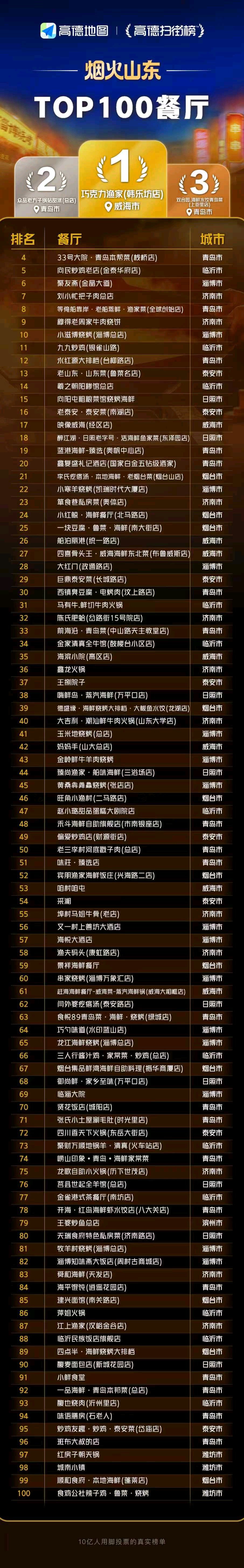 值得一提的是,随同报告一同发布的《山东省TOP100餐厅》榜单中,济南市上榜11家门店;全省共计上榜11个地市,其中上榜数超过10家的城市共有五个,这反映出山东省餐饮生态的较为分布均衡,城城有特色,各地有烟火。