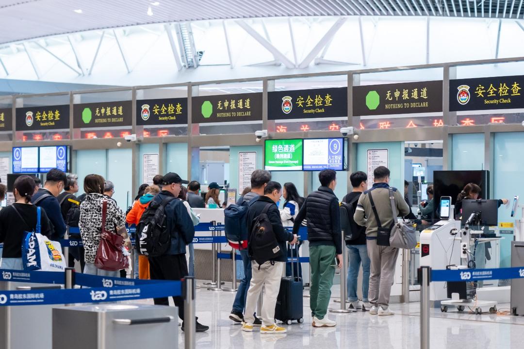 针对免签背景下的出入境客流高峰,青岛机场制作四国语言服务指南、持续提升境外来宾服务中心和问询台智能翻译设备使用率;加大志愿服务和值班值守力量,全力保障旅客出行顺畅。青岛胶东机场海关综合运用出境“一次过检”、入境行李“双预检”等技术,为旅客带来高效、便捷的通关体验;青岛机场边检站通过高峰时段增设通道、设置绿色通道、实施外国人入境卡网上填报等举措,确保口岸运行安全高效。