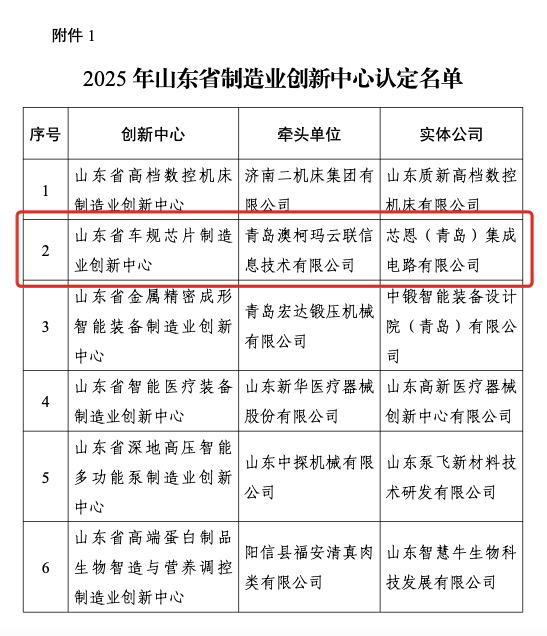 近日,山东省工信厅下发《2025年山东省制造业创新中心认定及培育名单》,共有6家企业被认定为创新中心,其中青岛澳柯玛云联信息技术有限公司(简称“澳柯玛云联”)作为牵头单位,芯恩(青岛)集成电路有限公司(简称“青岛芯恩”)作为实体公司的山东省车规芯片制造业创新中心备受关注。