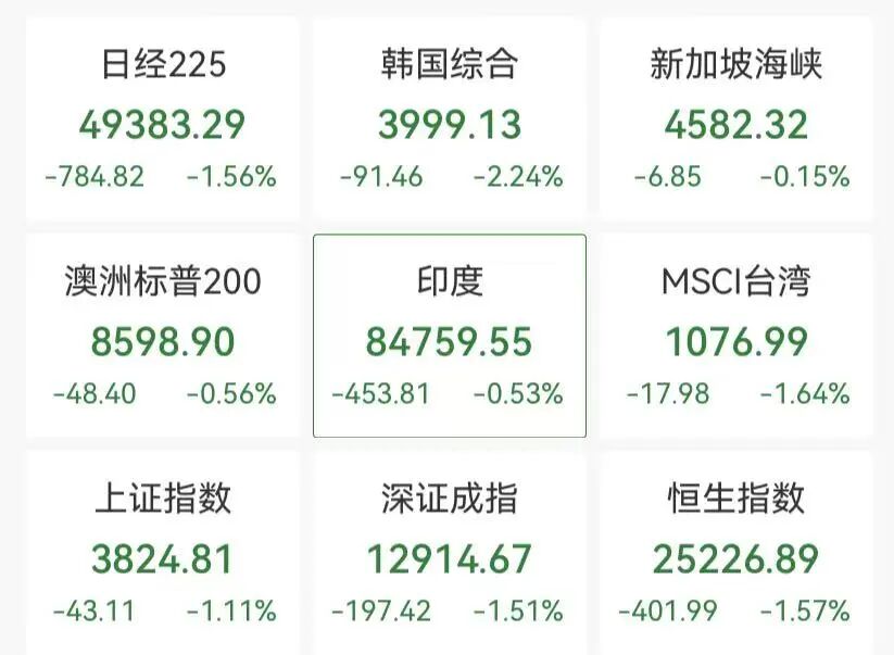 12月16日,亚太主要股指延续跌势,日经225指数收跌超1%,韩国KOSPI指数收跌超2%,A股三大指数集体飘绿,港股午后跌幅进一步扩大;黄金白银盘中跳水。