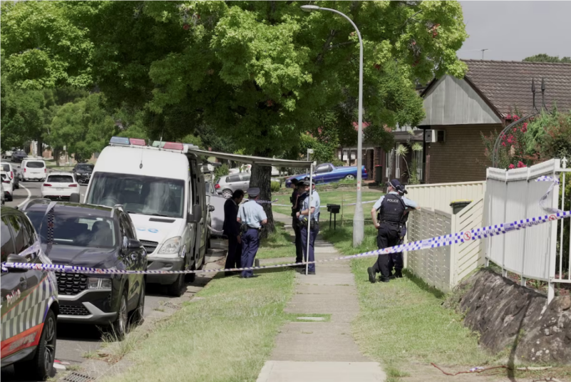 当地时间12月15日,澳大利亚警方在邦迪滩案嫌疑人住所外站岗。 图源:外媒报道配图
