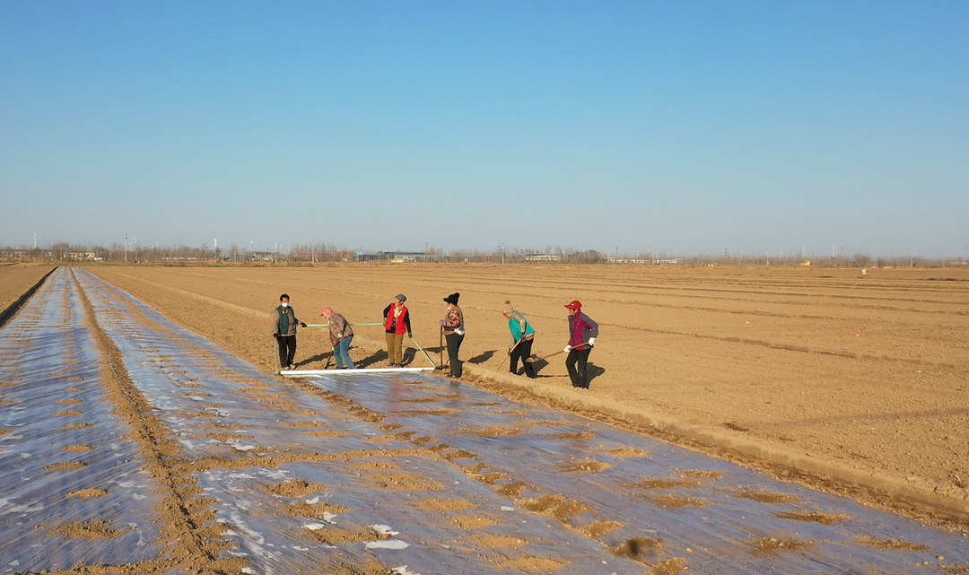 在武城县南北官庄村,种粮大户刘凯的地里,工人分工协作,正有条不紊地为小麦幼苗铺设地膜,一派繁忙的冬管景象。“铺地膜的作用首先是保墒,能锁住田间水分,然后是提高地温,地温能提到1到3摄氏度。”刘凯介绍说。
