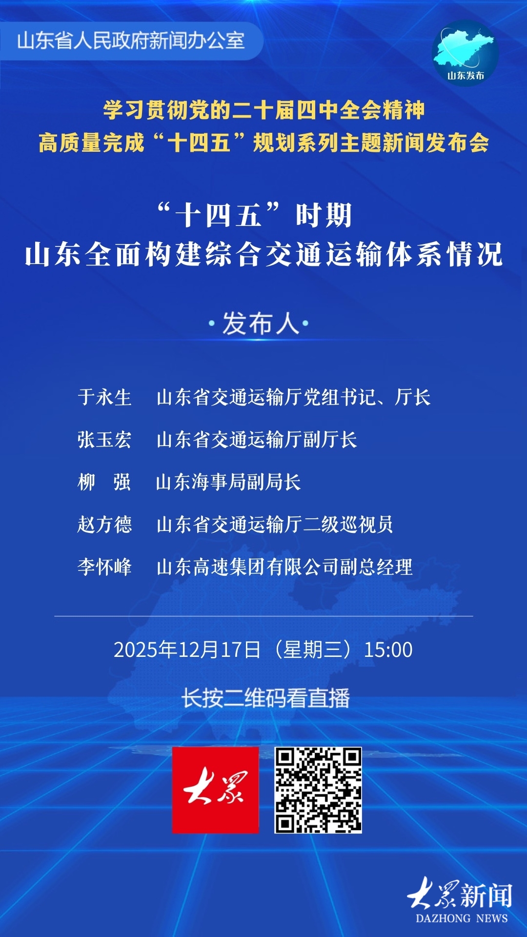 事关构建综合交通运输体系!今天下午3时山东省政府将举行新闻发布会山东发布 | 2025-12-17 14:21:46 原创崔晗 申家鑫来源:大众新闻微信扫码扫码下载客户端山东省政府新闻办定于12月17日(周三)下午3:00举行省政府新闻办新闻发布会,邀请省交通运输厅主要负责同志等介绍“十四五”时期山东全面构建综合交通运输体系情况。(大众新闻记者 崔晗 申佳鑫)责任编辑:许光宇