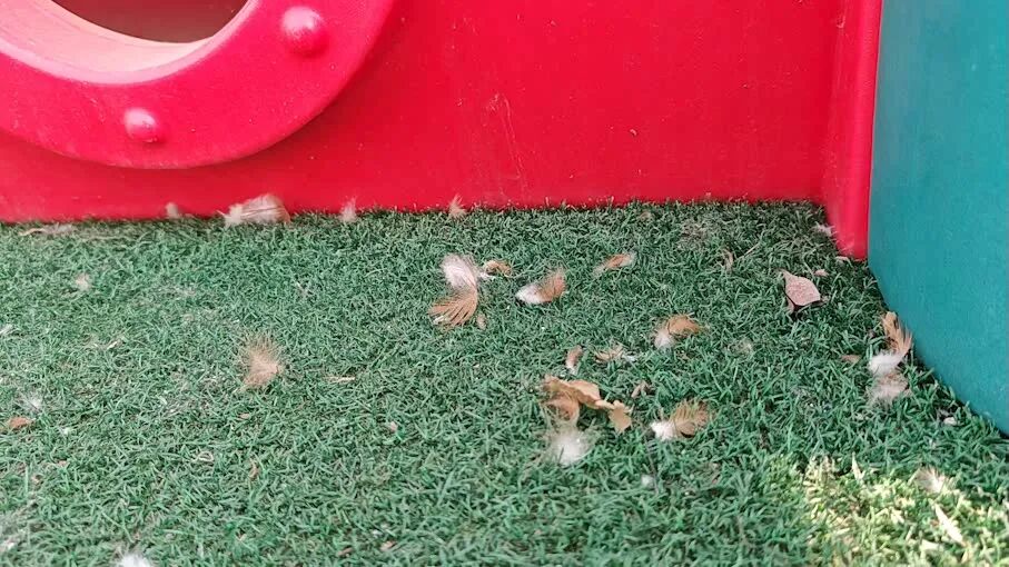 记者在现场看到,幼儿园的教室分列在东西两侧,中间是幼儿园操场,东侧教室外面就是养鸡场的厂房,透过教室窗户,记者可以看到一个红色的铁门,据牛女士介绍,这里原来就是养鸡场的排粪口,经过她多次反映已经关了起来,但仍有鸡屎的味道。操场里的儿童滑梯和草地上还能看到不少的鸡毛。