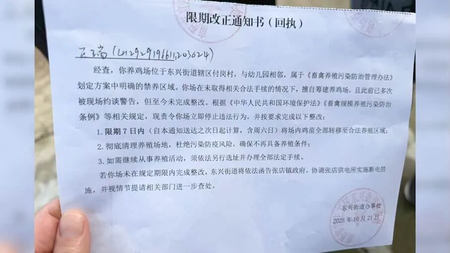 10月21日,东兴街道办事处出具了一份限期整改通知书,上面显示,“经查,养鸡场位于东兴街道辖区付岗村,与幼儿园相邻,属于《畜禽养殖污染防治管理办法》划定方案中明确的禁养区域。你场在未取得相关合法手续的情况下,擅自筹建养鸡场,且此前已多次被现场约谈警告,但至今未完成整改。根据《中华人民共和国环境保护法》《畜禽规模养殖污染防治条例》等相关规定,现责令你场立即停止违法行为”。